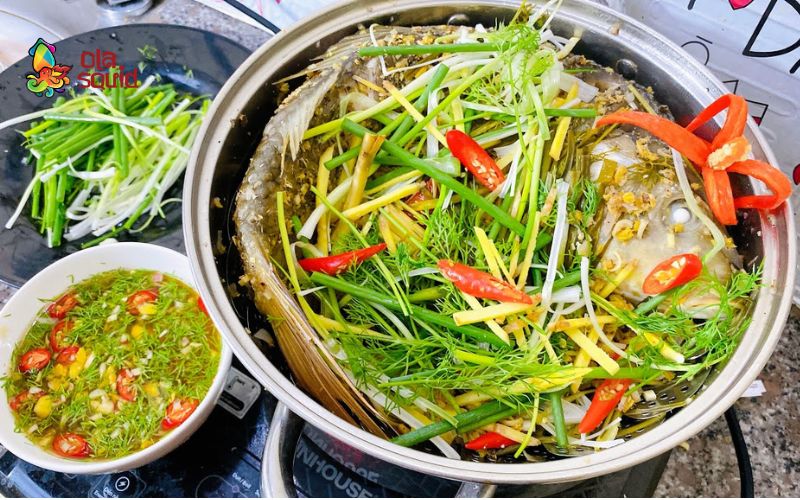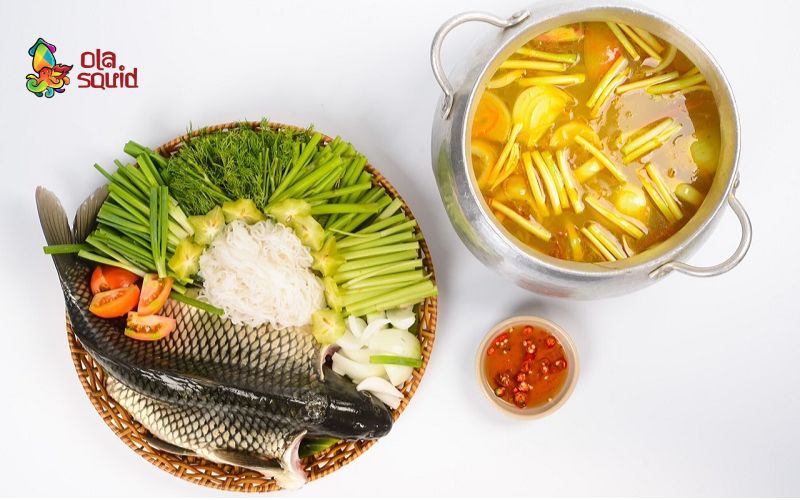 Nồi lẩu nóng hổi với nước dùng chua ngọt, thanh nhẹ, thấm hương thơm từ hành tây và chút cay nồng của sa tế, kết hợp cùng thịt cá chép mềm ngọt tự nhiên, dai giòn nơi thớ thịt.