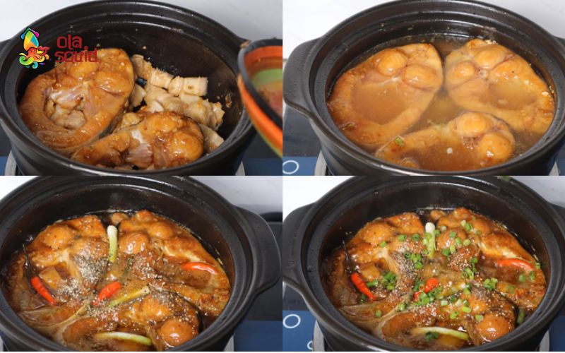 - Bước 3: Đun 2 muỗng đường trong nồi đất đến khi chuyển màu nâu cánh gián, cho thịt vào đảo săn. Tiếp theo cho cá, thêm nước mắm và 1 muỗng dầu ăn, đảo đều. Đổ nước xăm xắp, đun sôi rồi vặn nhỏ lửa, kho 30 phút đến khi nước sánh. Cuối cùng thêm hành lá và tiêu, tắt bếp.