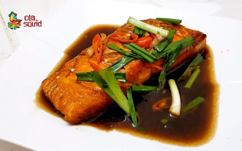 • Bước 3 – Nấu sốt xì dầu: Kế tiếp, bạn pha xì dầu với đường và bột ngọt. Đun nóng ít dầu, cho gừng vào đảo thơm rồi thêm hỗn hợp xì dầu và nước, cho hành lá và ớt vào nấu nhanh. Sau cùng, bạn rưới đều nước sốt xì dầu lên cá hồi áp chảo và thưởng thức ngay khi còn nóng.