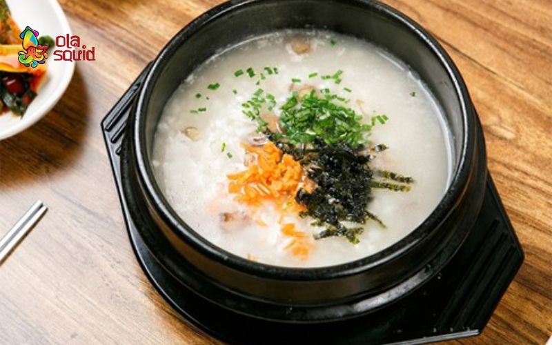 - Khi hỗn hợp sôi, bạn cho cháo trắng vào khuấy đều rồi nấu đến khi cháo sôi lăn tăn thì rắc hành ngò, tắt bếp là hoàn thành.
