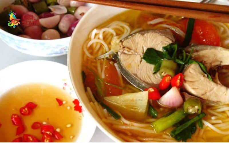 - Bước 4 – Hoàn thiện: Trụng bún tươi với nước sôi rồi múc bún ra tô, thêm cá, nước lèo, cà chua, thơm và hành tây thái múi cau. Cuối cùng, bạn trang trí thêm hành lá, ngò rí và ăn kèm cùng rau sống.