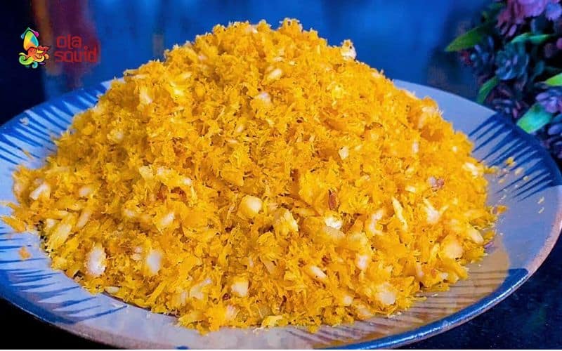 - Bước 4: Phi thơm hành tỏi với dầu màu điều, sau đó bỏ phần hành tỏi và cho thịt cá vào xào trên lửa nhỏ khoảng 30-45 phút đến khi khô ráo. Ruốc cá thu thành phẩm sẽ có màu vàng đẹp mắt, hương thơm nhẹ đặc trưng và vị đậm đà, bùi béo, rất hấp dẫn.