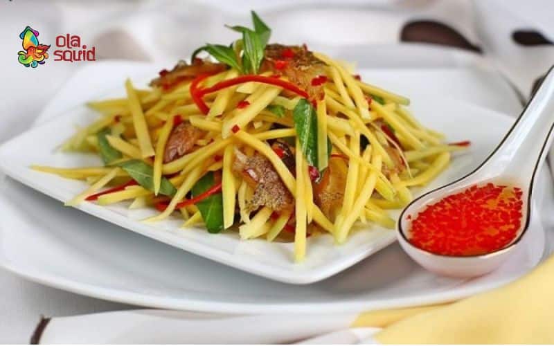 - Bước 3: Giã tỏi và ớt, thêm đường và nước mắm tạo vị mặn ngọt hài hòa. Cuối cùng, bạn cho xoài, cá thu xé và rau thơm vào thố, rưới nước mắm lên gỏi rồi đảo nhẹ tay trộn đều.
