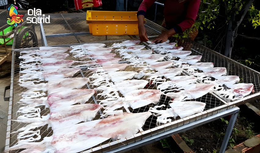- Mực chưa ráo nước đã đem phơi: Độ ẩm dư thừa làm mực lâu khô, dễ bị nhớt và có mùi. Luôn để ráo ít nhất 20 phút trước khi phơi.