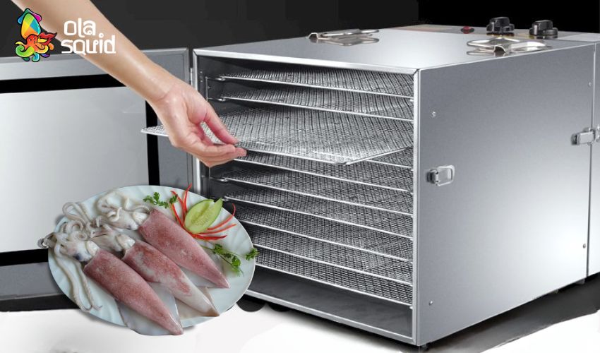 - Cách sắp xếp: Xếp mực thành một lớp duy nhất trên khay sấy, không chồng lên nhau để luồng khí nóng lưu thông đều.