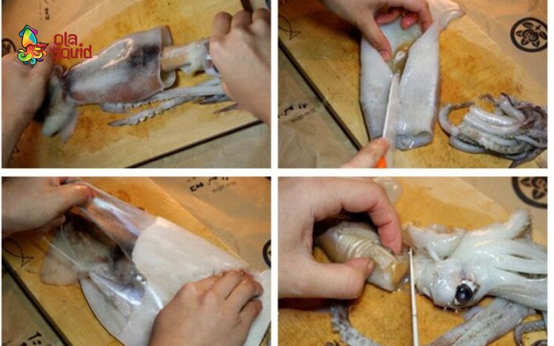 - Bước 3 – Lột da và làm sạch bụng mực: Với các loại mực lớn như mực lá hay mực nang, bạn cần loại bỏ lớp da bên ngoài để món ăn được ngon.
