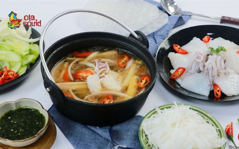 - Bước 4: Khi nước lẩu sôi, bạn cho mực vào nhúng khoảng 1-2 phút đến khi vừa chín tới thì vớt ra ngay để giữ độ giòn. Ăn kèm rau, nấm và bún, chấm cùng nước mắm ớt hoặc muối tiêu chanh.