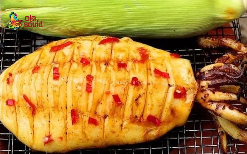- Bước 4: Xếp mực lên vỉ, nướng trên bếp than hoặc bếp điện. Mỗi mặt nướng khoảng 4-5 phút, trong quá trình nướng nên phết thêm sốt để mực không bị khô và dậy mùi thơm.