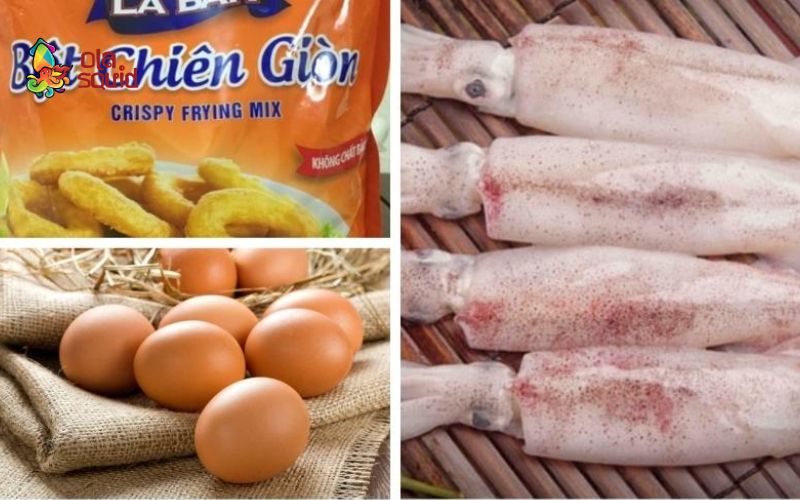 Các nguyên liệu cần có như mực tươi, bột chiên giòn, trứng gà,…