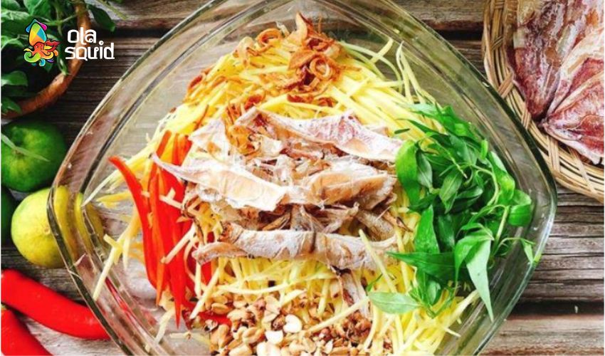 Nếu muốn đổi vị cho bữa cơm gia đình, bạn có thể làm gỏi mực cơm khô cùng xoài xanh, cà rốt, rau răm và ớt sừng. Mực sau khi nướng sơ được xé nhỏ, trộn cùng nước mắm chua ngọt và các loại rau củ. Món gỏi vừa thơm mùi mực nướng, vừa có vị chua cay mặn ngọt hài hòa, rất kích thích vị giác, thích hợp làm món khai vị trong các bữa tiệc gia đình.