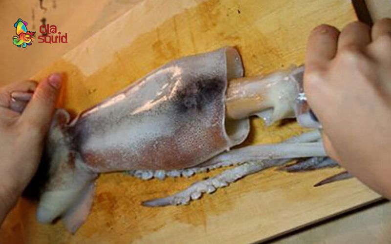- Bước 1 – Làm sạch mực: Nhẹ nhàng tách phần đầu ra khỏi thân mực, sau đó kéo theo toàn bộ nội tạng ra ngoài. Khi thao tác, bạn cần làm chậm và dứt khoát để tránh làm vỡ túi mực, vì nếu vỡ sẽ khiến mực bị ám màu và có vị đắng.