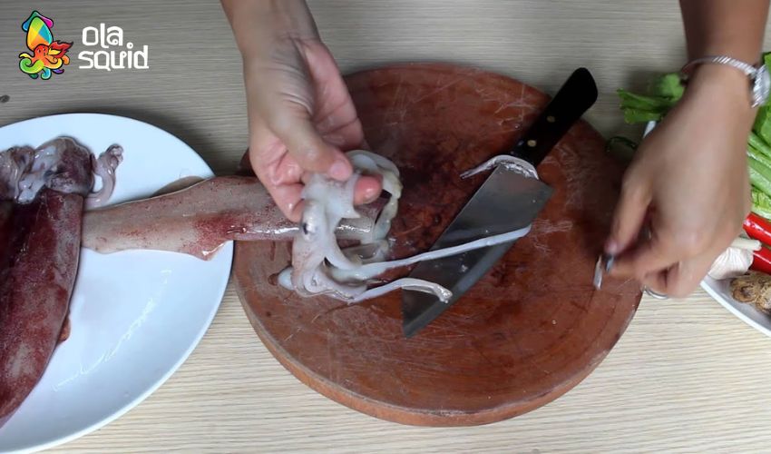 - Không dùng dao cắt trực tiếp vào vùng đầu mực khi chưa tách phần nội tạng, rất dễ đứt túi mực.