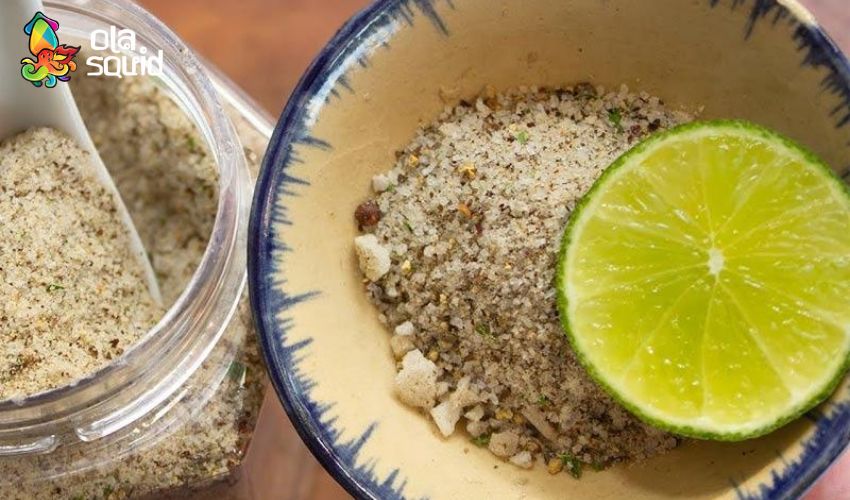 - Trộn muối rang với tiêu đen xay và lá chanh thái chỉ mỏng.