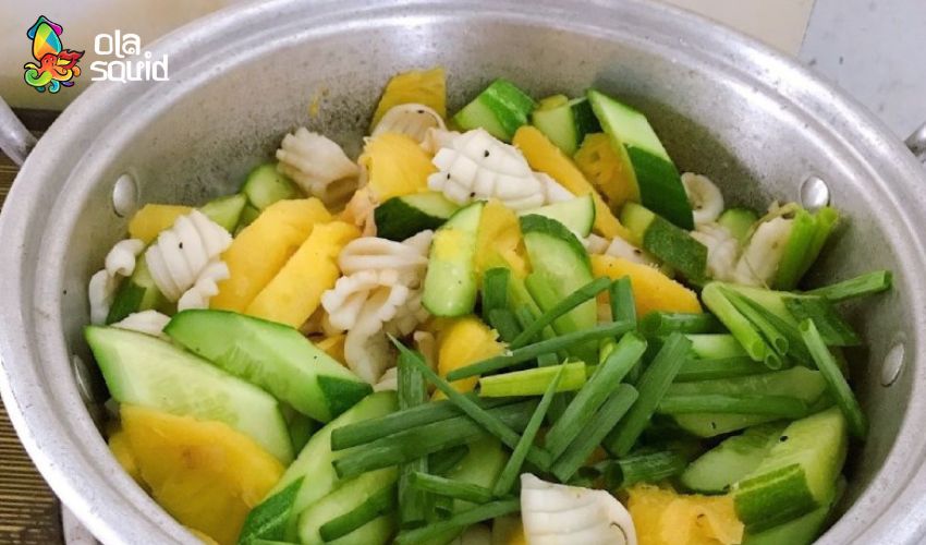 Một biến thể khác cực kỳ hấp dẫn là mực xào dưa leo khóm. Vị chua ngọt tự nhiên của dứa không chỉ giúp cân bằng hương vị, mà còn làm món ăn dậy mùi đặc trưng. Khi xào, thêm vài lát gừng tươi và một ít nước cốt dứa, bạn sẽ có món xào thơm lừng.