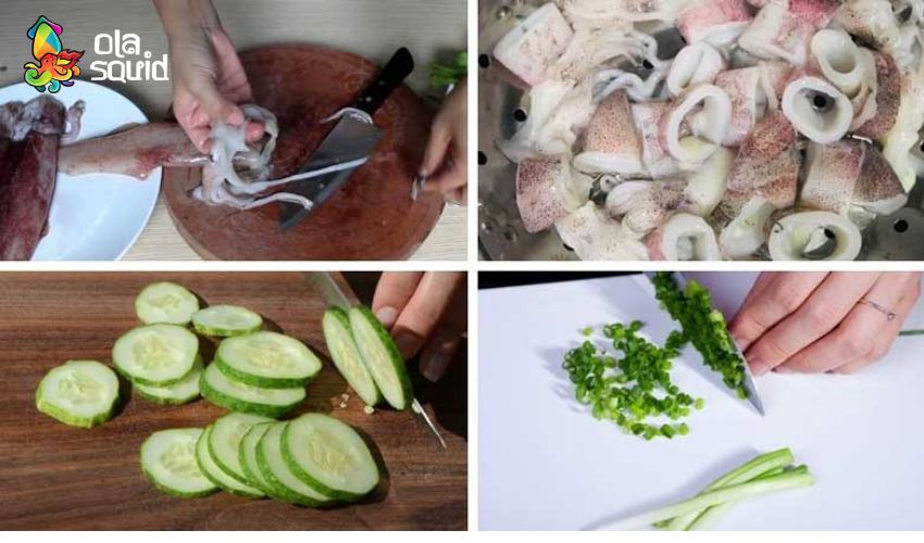 Chuẩn bị nguyên liệu làm mực xào dưa leo