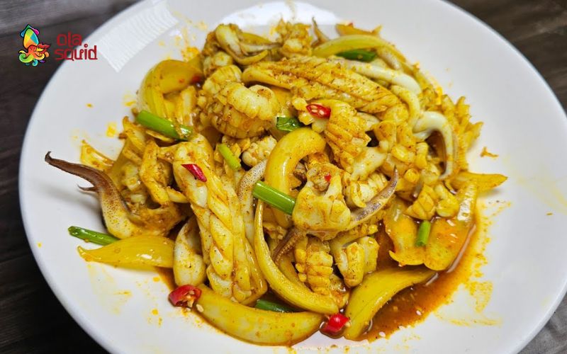 Bạn có thể thay đổi khẩu vị cho thực đơn gia đình với món mực xào cà ri sả ớt. Món ăn này độc đáo với màu vàng bắt mắt và hương thơm mới lạ từ bột cà ri cùng sả tươi. Mực được xào săn, giòn dai và giữ nguyên vị ngọt tự nhiên, hòa quyện cùng vị cay nồng, thơm lừng của gia vị, tạo nên hương vị đặc trưng khó quên. Để thưởng thức trọn vẹn món ăn, bạn nên ăn kèm cùng cơm trắng và chút nước tương tỏi ớt.