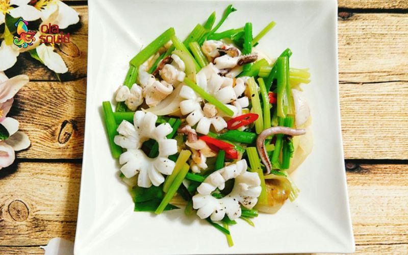 Mực xào gì ngon? Vậy thì bạn có thể tham khảo món mực xào cần tỏi với hương vị vô cùng cuốn hút. Mực tươi trắng trong hoà quyện cùng cần tây và tỏi tây nồng thơm, nấm hương mềm mọng, cà rốt giòn ngọt và chút tỏi phi dậy mùi, khiến món ăn thêm hài hòa, kích thích vị giác và đầy quyến rũ. Không chỉ hấp dẫn mà còn bổ dưỡng, món mực xào cần tỏi là lựa chọn tuyệt vời cho bữa cơm gia đình.