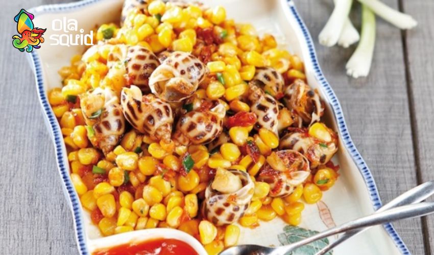Đây là món ăn có sự kết hợp cực kỳ thú vị giữa vị ngọt béo của bắp và vị thơm của ốc hương. Bắp giúp nước sốt sánh hơn, đồng thời làm món ăn có độ ngọt tự nhiên.