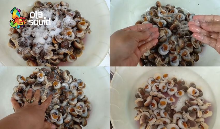 - Ngâm ốc trong nước muối ớt 20–30 phút để loại bỏ bùn. Rửa lại nhiều lần cho thật sạch.