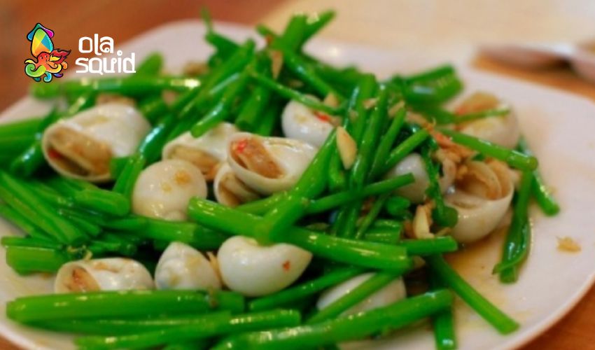Ốc mỡ xào rau muống là món ăn dân dã nhưng cực kỳ đưa cơm và hợp khẩu vị nhiều người. Thịt ốc mỡ béo mềm kết hợp với rau muống giòn xanh, thấm gia vị vừa phải, tạo nên món xào hấp dẫn mà không bị ngấy. Đây cũng là món rất quen thuộc trong các quán ốc nhờ vị thơm ngon, dễ ăn và giá thành phải chăng.