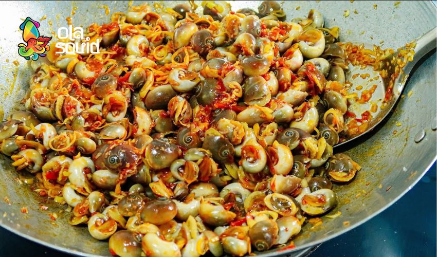 - Xào khoảng 3–5 phút đến khi ốc mở nắp là vừa chín.