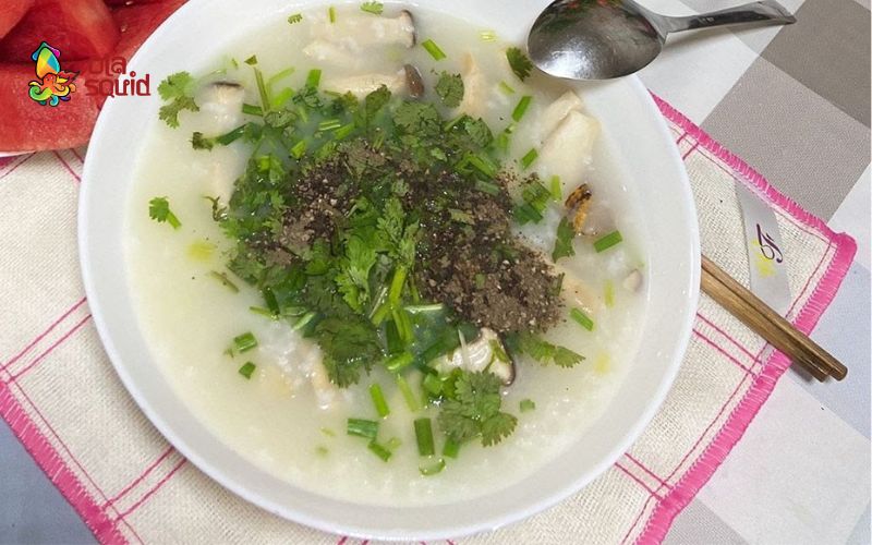 - Phi thơm tỏi với dầu, cho mực vào xào nhanh rồi thêm sò điệp, nêm vừa ăn. Tiếp tục cho nấm đùi gà, chả lụa và cà rốt vào đảo đến khi chín, rắc tiêu rồi trút ra tô.