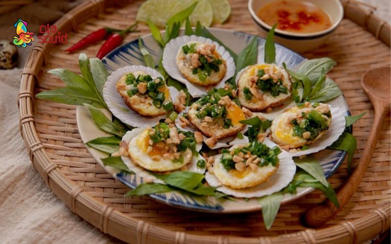 - Sau đó bạn đun nóng chảo khuôn, cho dầu vào từng ô. Tiếp tục thêm cồi sò và trứng cút, nấu đến khi trứng chín, rồi rắc hành lá lên và nhấc ra. Cuối cùng đặt sò điệp và trứng vào vỏ, rưới sốt lên trên và dùng nóng.